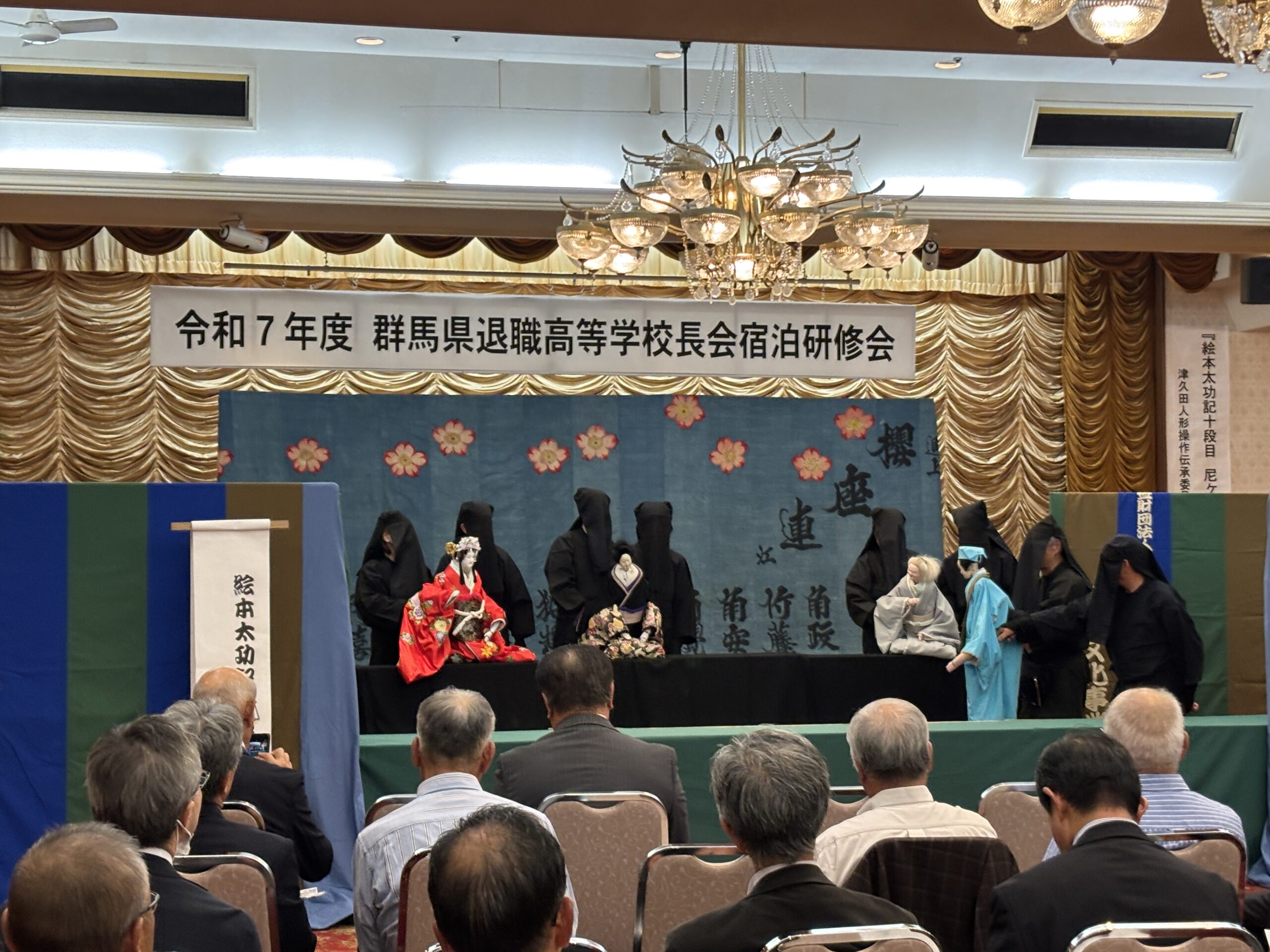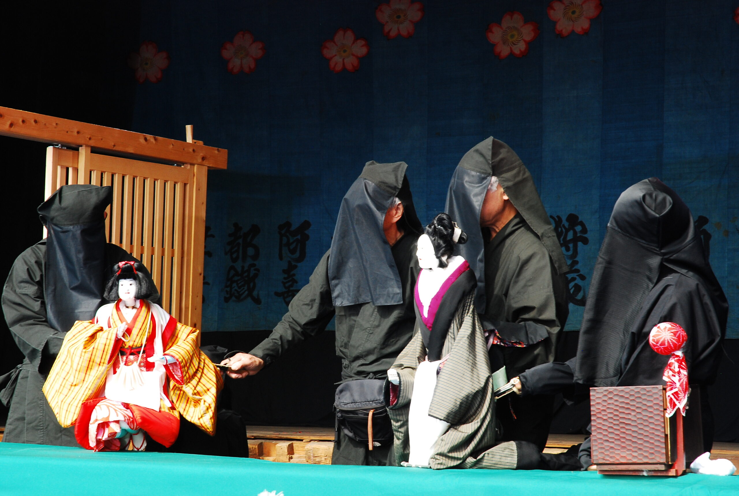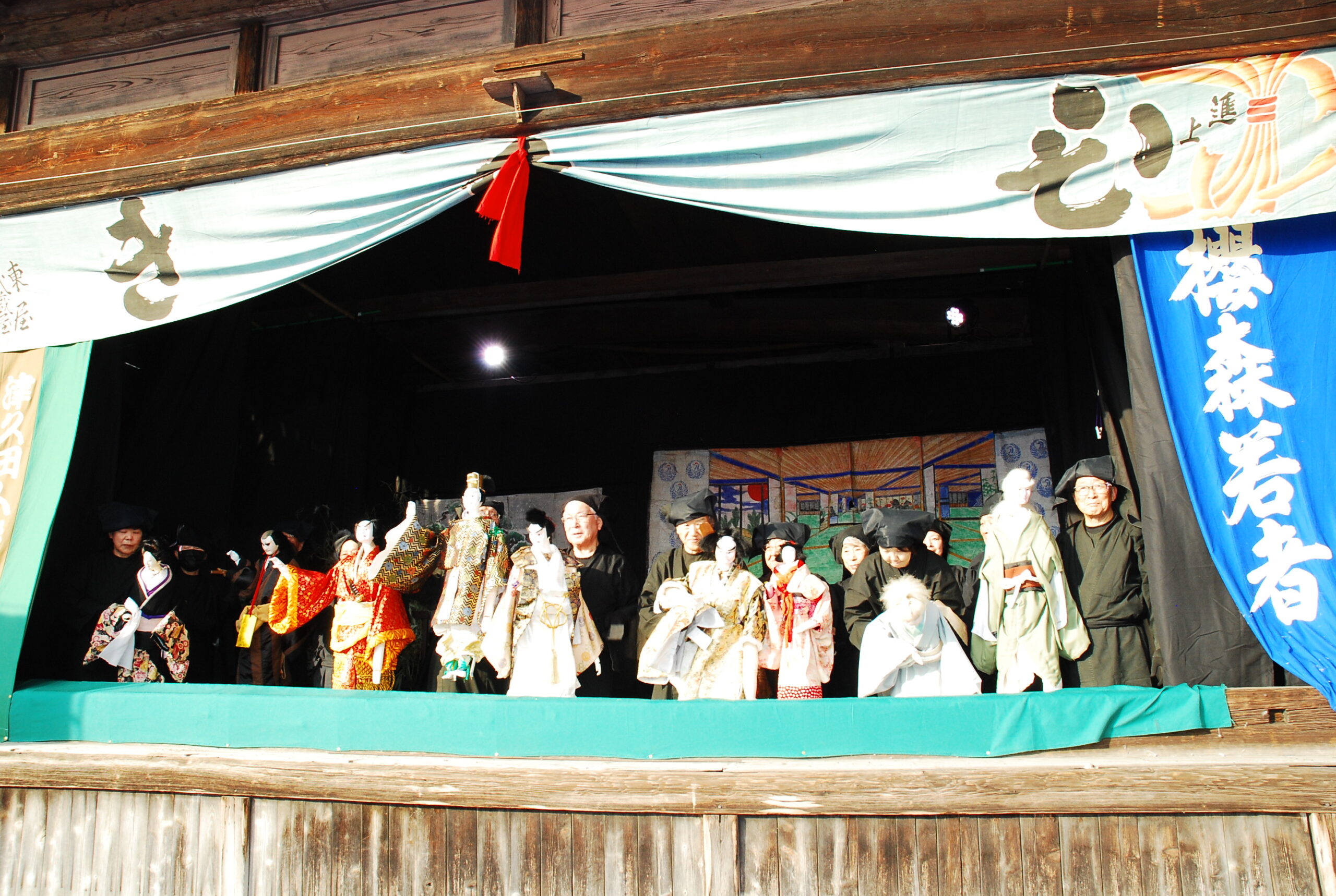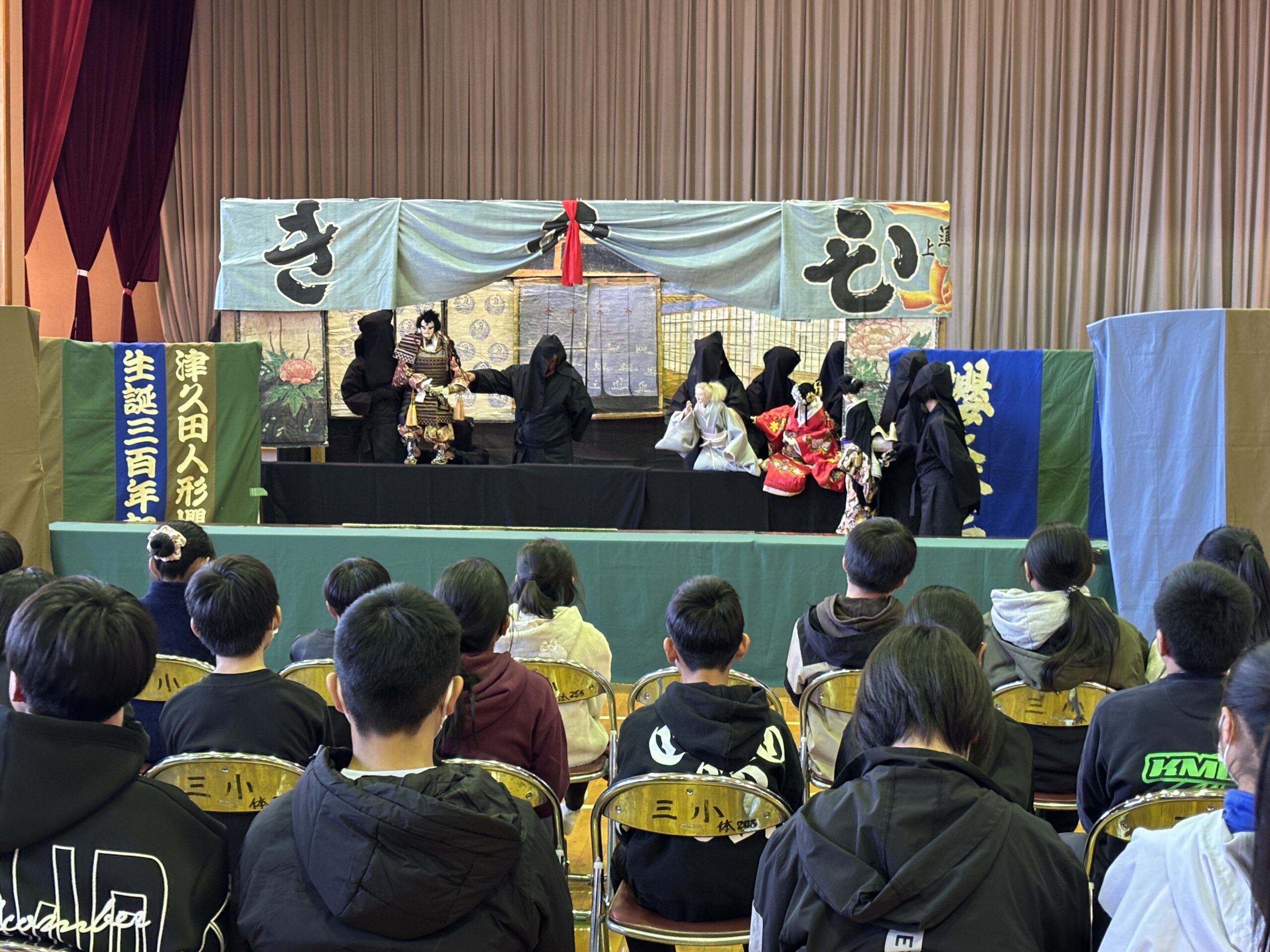 人形舞台での地域鑑賞会は雨天で一日順延になりましたが、おかげさまで良い天気に恵まれ、大勢のお客さんに来場していただきました。200年を超える伝統ある農村舞台で、観客と演者が一体となって温かい拍手がわきおこる感動的な舞台となりました。演目:三番叟、傾城阿波の鳴門 巡礼歌の段、モチモチの木、奥州安達ケ原三段目 袖萩祭文の段・県退職高校長会、古巻中学校、三原田小学校で公演と人形の操作体験をしました。皆さん、大変興味深そうに体験、鑑賞してくれました。